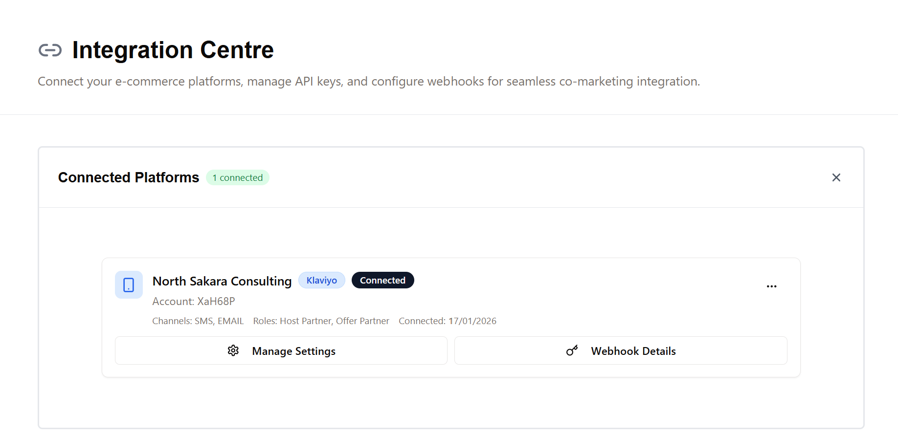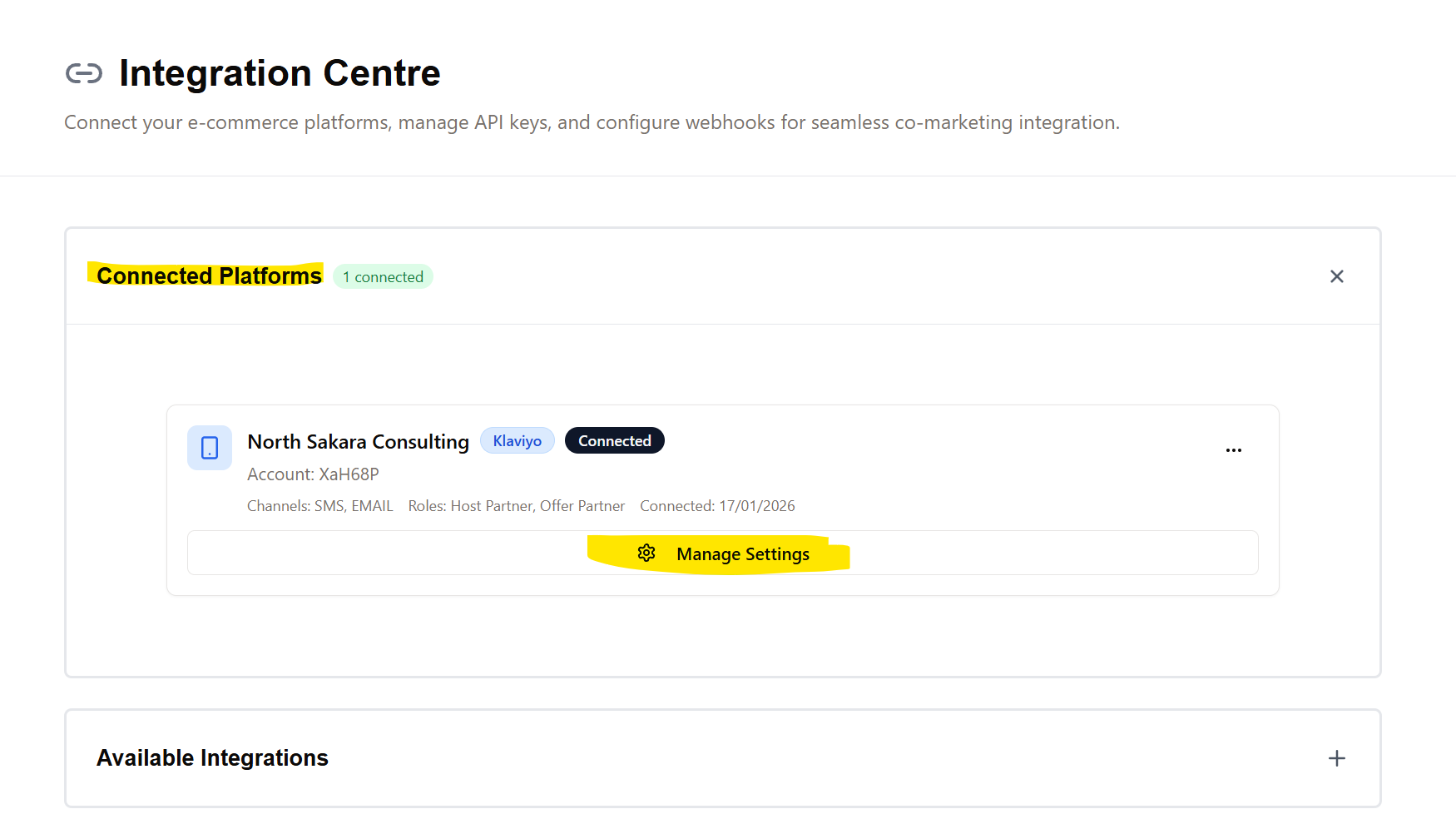 2 - In Barika, navigate to Integration Centre → Expand the Connected Platforms section →Look for your Klaviyo card →click Manage Settings on the Klaviyo card