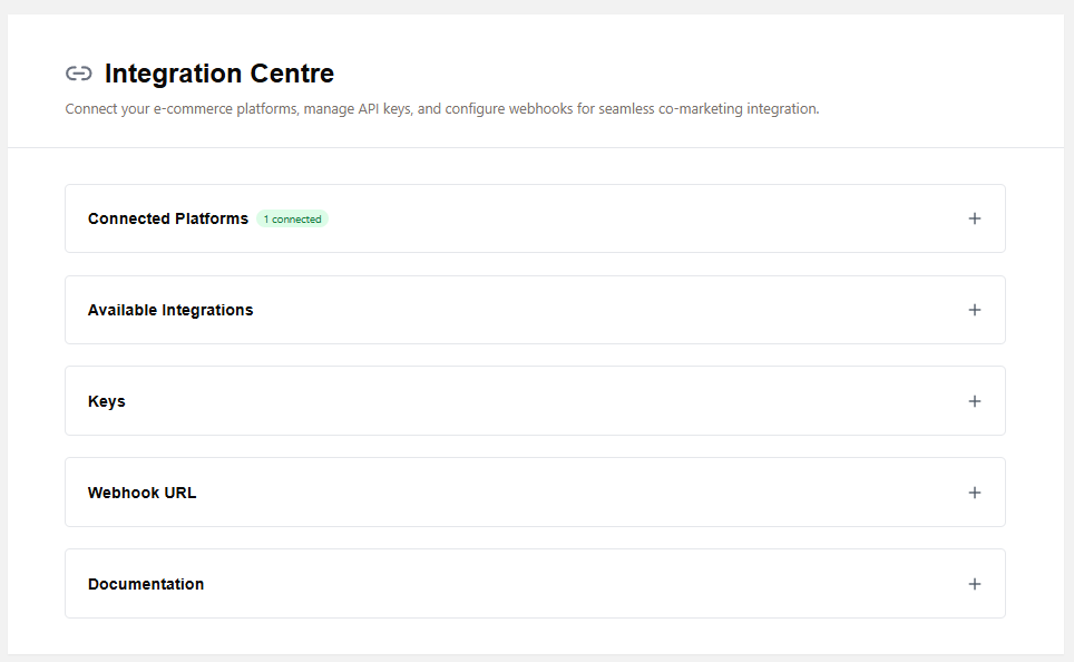 Expected Result: The Dashboard shows high-level co-marketing activity, and each centre provides visibility into its specific area (offers, partnerships, revenue, spend). Revenue Centre shows real data from the Use Case 6 test order. Other centres may show empty states, which is realistic for a test account - this demonstrates the platform handles both active and inactive states appropriately.