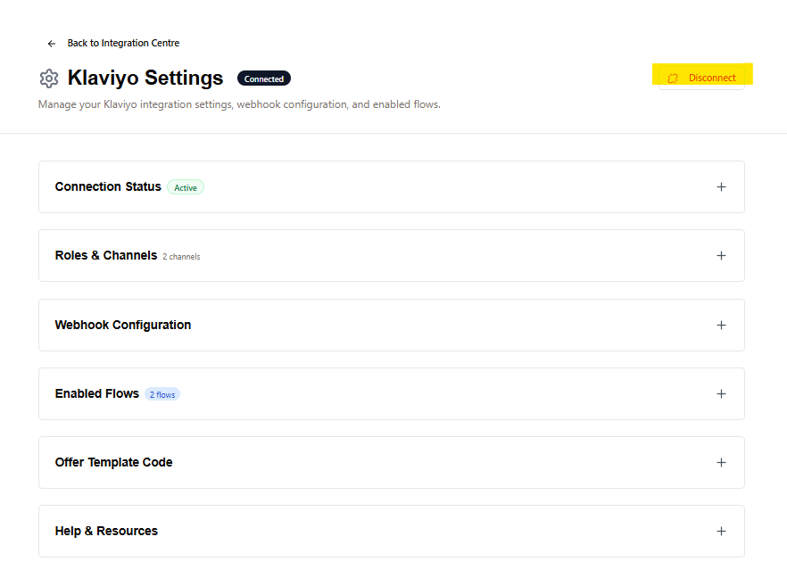 - The Klaviyo card returns to "Not Connected" state