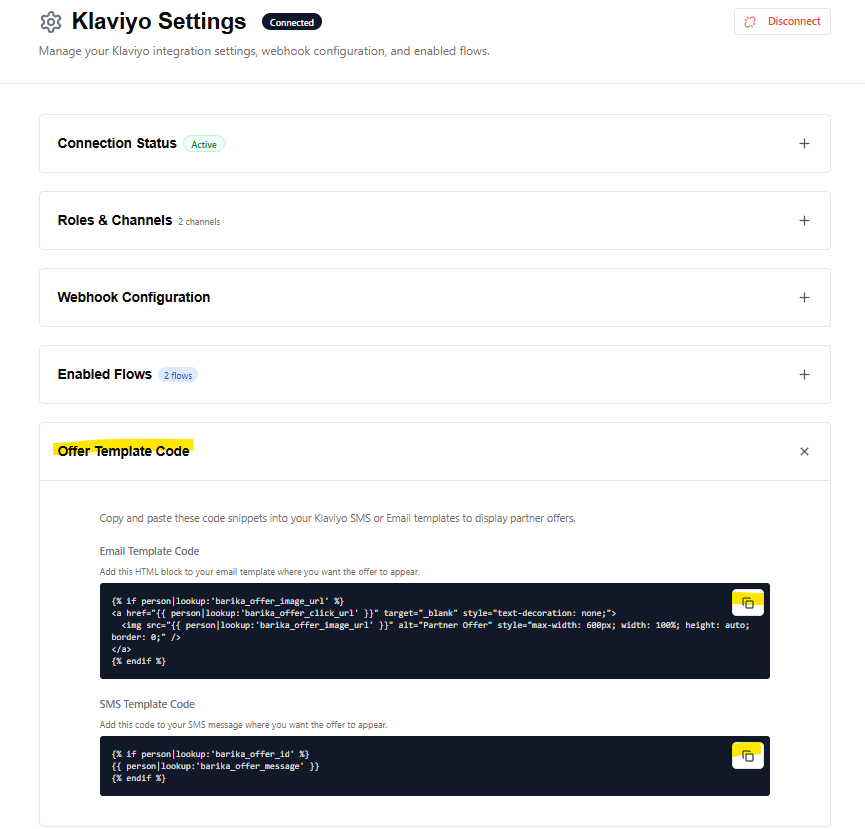 Expected Result: All connection details, webhook configuration, and offer template code are visible and can be copied directly from the settings page.