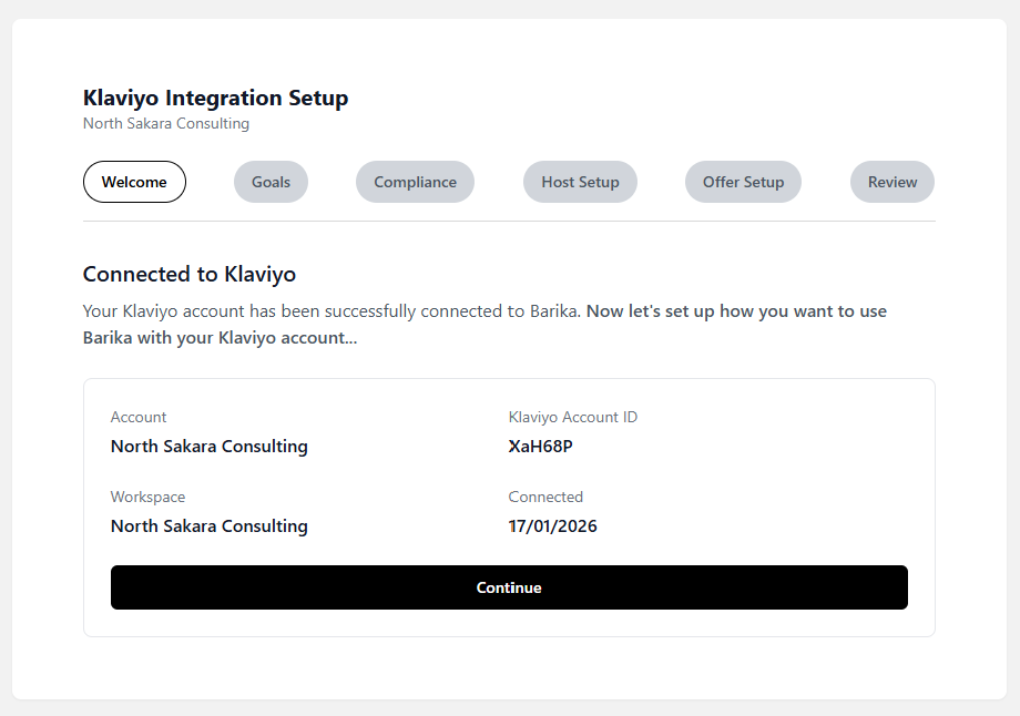 8 - You will be redirected to the Barika + Klaviyo setup wizard