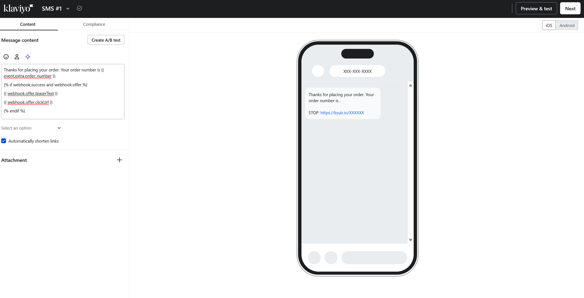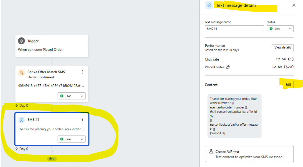 - The Klaviyo flow continues, embedding offer data in the SMS/Email message