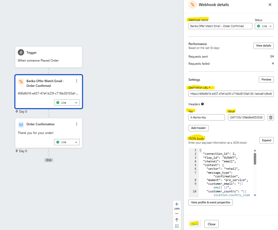 Webhook is configured in Klaviyo. When the flow triggers, Barika will receive the webhook and match an offer.